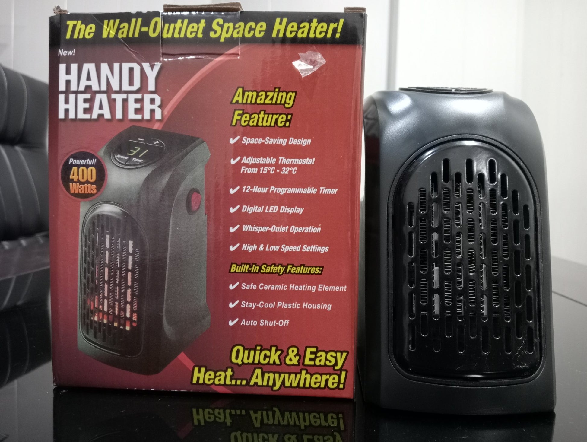 Introducing handy heater the wall-outlet space heater! other space heaters are big and bulky and can raise your heating Bill! handy heater is the whole room space heater that plugs right into the wall and takes up no space at all! Handy Heater’s thermo-ceramic design makes it small but powerful. Handy Heater 400 watt power warms up to 250 sq. Ft. Of warm comforting heat! transform any cold and chilly place into warm and cozy place!